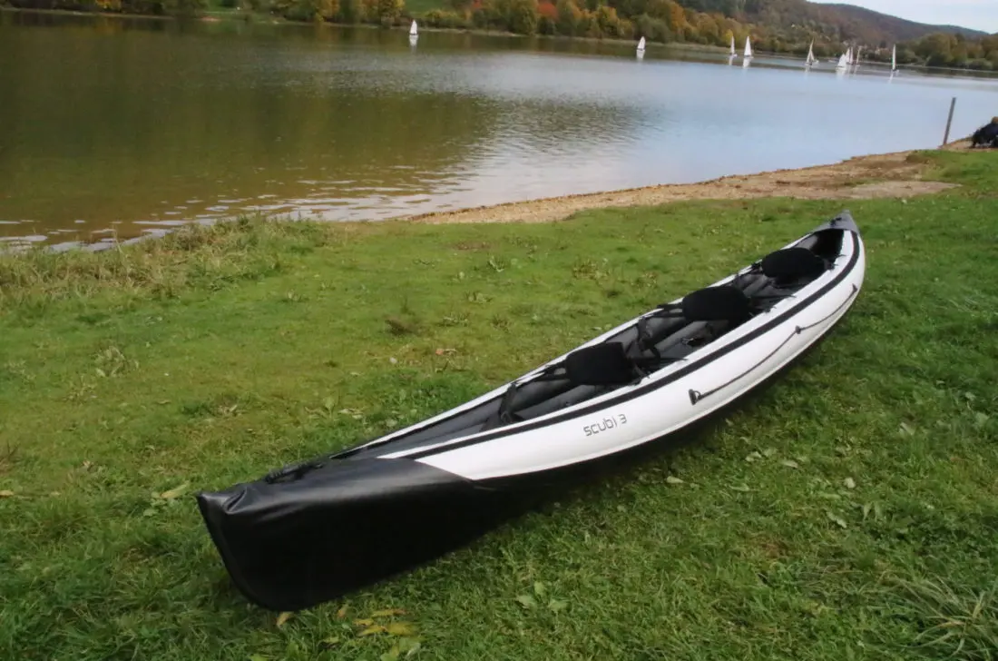 Scheitern muss der Sonnentag auf dem Wasser dennoch nicht, denn mit dem nortik scubi 3 gibt es eine zerlegbare Alternative. Die Einsatzmöglichkeiten dieses Faltboots sind vielfältig: Eine dreiköpfige Kleinfamilie passt mühelos rein, egal, ob Vater und Mutter mit einem Kind oder ein Elternteil mit zwei Kindern. Wer mag, kann auch seinen Hund in der Bootsmitte unterbringen – in diesem Fall empfiehlt sich eine Matte, um den Boden vor Krallenkratzern zu schützen. Drei Erwachsene gehen auch, die vollwertigen Hängesitze bieten ausreichend Beinfreiheit. Natürlich kann man das scubi 3 auch zu zweit paddeln. In diesem Fall lässt sich der halbe Hausstand in der Bootsmitte unterbringen. Naja, fast, aber für Zelt und Zahnbürsten, Isomatten und einen kleinen Grill ist auf jeden Fall Platz, denn die mittlere Sitzfläche kann bei Bedarf entnommen werden. Wer darauf aus ist, das Bootsinnere trocken zu halten, muss sich den Kopf auch nicht zerbrechen: Sogar mit dem optionalen Verdeck (inklusive drei Spritzschürzen) bleibt die Vielfalt der Einsatzmöglichkeiten erhalten, denn die Luken können mit den entsprechenden Deckeln (ebenfalls im optionalen Zubehör) nach Gusto verschlossen werden.