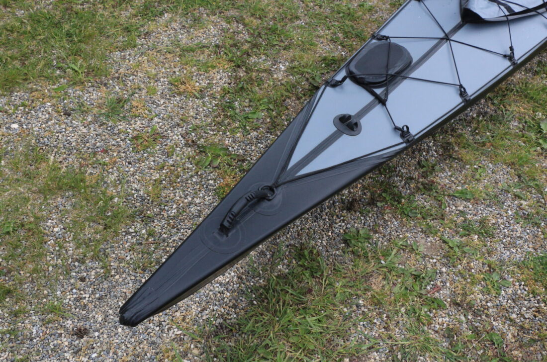 Das Triton Ladoga 1 advanced liegt beim Testival von Out-Trade direkt neben den anderen Seekajaks der Ulmer Faltboot-Spezialisten, den nortik-Modellen argo und navigator. Dabei fällt ein wichtiger Unterschied sofort auf: Beim Ladoga liegen das Cockpit und die breiteste Stelle deutlich hinter der Bootsmitte – »schwedenförmig« nennen Fachleute dieses Rumpfdesign. Dazu kommen eine ausgeprägte V-Form in Bug und Heck, ein im Gegensatz zu diesen schlanken Bereichen breiterer und im Unterschiff flacherer Cockpitbereich sowie eine konstruktionsbedingt extrem hohe Steifigkeit.