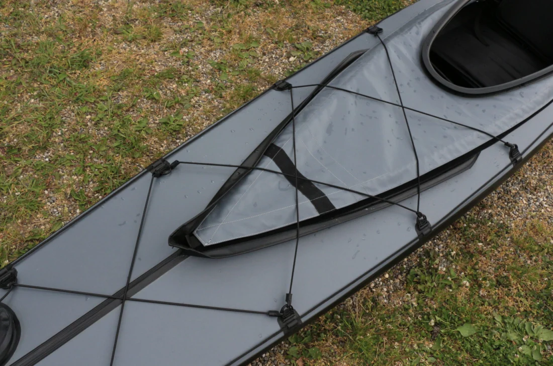 Die Summe dieser Eigenschaften macht das Ladoga zu einem waschechten Allrounder mit Tendenz zum Seekajak. Seine Einsatzbereiche: für ein Boot dieser Länge ausreichend breite Wanderflüsse, Seen und Meeresküste, wobei man sich durchaus mal ein bisschen Abstand vom Land zutrauen darf. Ausreichend Ladekapazität für eine mehrtägige Tour bietet das Ladoga allemal, allerdings wirkt sich hier einmal mehr die »Schwedenform« aus: Der Löwenanteil des Stauraums liegt im langgestreckten Bug – und da die Beladung faltboottypisch in erster Linie durch das Cockpit erfolgt, haben die Bootsdesigner gut daran getan, im Bug eine kleine, wasserdicht verschließbare Ladeluke zu installieren. Die dient einerseits dazu, Gepäckstücke bis in die Bootsspitze ziehen zu können. Und andererseits dem schnellen Zugriff auf Dinge, die man darunter platziert – seien das nun ein Erste-Hilfe-Paket, ein dicker Pulli oder Teebeutel fürs Heißgetränk am Lagerfeuer. Klar, ein Teil des Gepäcks passt auch ins Heck, aber da dieses nunmal relativ kurz ausfällt, haben sich die Bootsdesigner hier eine Durchgriffsluke gespart. Wer das Be- und Entladen durch die Cockpitluke als umständlich empfindet, hat allerdings eine weitere Möglichkeit: Verdeck abnehmen und das komplette Gepäck einfach von oben ins Boot bugsieren.