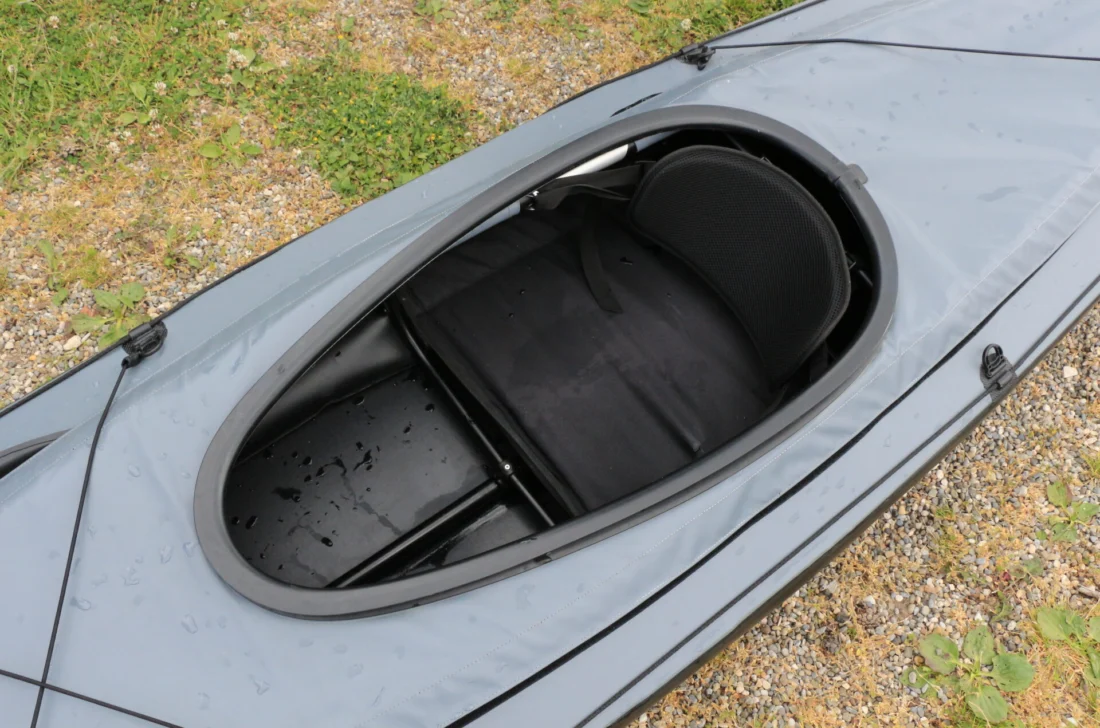 Okay, das Triton Ladoga 1 advanced tanzt also etwas aus der Reihe der konventionellen Seekajaks, seien das nun Falt- oder Festboote. Aber was bringt sie nun, diese etwas asymmetrische Bootsform? Das wird schnell deutlich, sobald man seine vier Buchstaben im Cockpit platziert und losgelegt hat – wobei vorausgeschickt werden soll: Das mit den vier Buchstaben und dem Cockpit zeigt schon, dass es sich beim Ladoga 1 advanced um ein Faltkajak mit sportlichem Charakter handelt – und nicht um eins der Einfach-paddeln-Freizeitboote der scubi-Liga. Die Cockpitluke des Ladoga ist nur 76,5 x 35 Zentimeter groß (zum Vergleich beim argo: 82,5 x 45,5 Zentimeter). Soll heißen: Zwei-Meter-Menschen mit steifen Hüften könnten das Einsteigen durchaus als Herausforderung empfinden – für durchschnittlich gelenkige Otto Normalverbraucher ist es aber kein Problem.