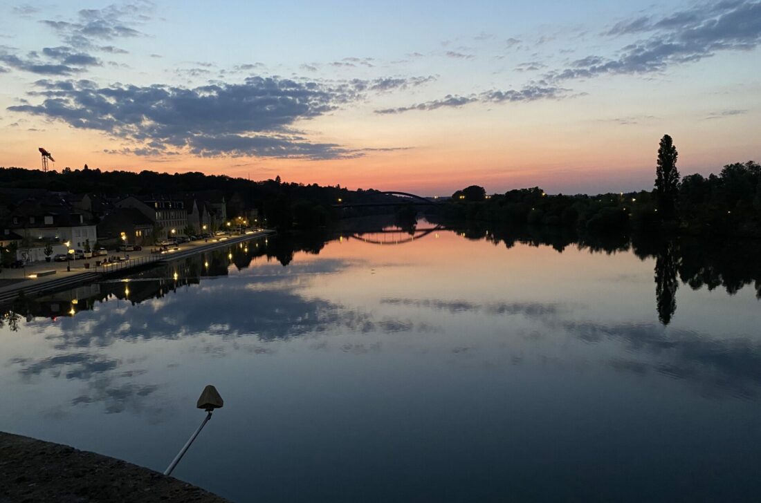 Am nächsten Morgen. Die Sonne knallt vom Himmel, als wolle sie den unterkühlt-grauen Mai dieses Jahres wettmachen. Unsere Boote liegen unverändert auf der Wiese, kieloben, wie sich das gehört. Allerdings hat eine Population Ohrenkneifer die so entstandenen Höhlen als neue Heimstatt erkoren, und so folgt vor dem Start auf dem Fluss eine Treibjagd auf die harmlosen, aber nervigen Tierchen. Dann geht es los. Die Mainpromenade zieht an uns vorbei, dahinter die Altstadt von Kitzingen. Die alte Mainbrücke sieht von unten genauso malerisch aus wie von oben, als wir von dort gestern den Sonnenuntergang bewundert haben.